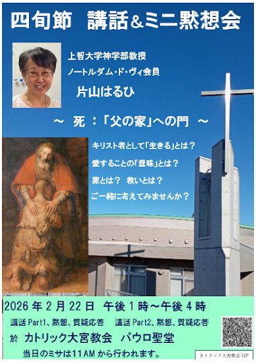 - 講話&mini黙想会 テーマ「死:『父の家』への門」カトリック大宮教会成人養成部では2026年2月22日、四旬節第一主日のミサ後に片山はるひ… 続きを読む: 講話&mini黙想会 テーマ「死:『父の家』への門」